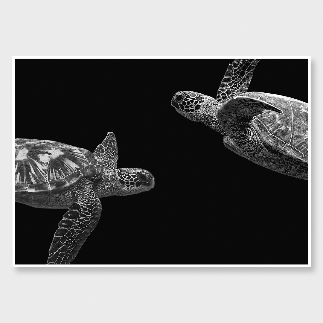 Two sea turtles glide with effortless grace, mirroring each other’s path in a slow, silent dialogue. Stripped of colour and context, the focus shifts to form, texture, and timeless rhythm.